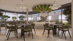 The design emphasizes the integration of architecture and landscape, with curved lines extending into the surrounding public plaza and drop-off driveway, creating a cohesive visual language. A sculpture at the focal point of the driveway enhances this sense of movement and fluidity, complementing the building’s contemporary aesthetic.