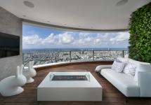 The panoramic balcony actually combines the balconies of the two apartments that were joined into one: "This way we managed to characterize two completely different areas," explains the designer. "In one of them, we incorporated a large dining area for entertaining, and in the other, a seating and lounging area centered around a fireplace. Between the two parts of the balcony, a green wall connects, creating a sense of one continuous unit."
