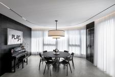 The perimeter lighting system in the ceiling of the public space envelops the dining area, which consists of a table with a wooden top and a marble leg polished in the shape of a drop. To leave the artistic leg as exposed as possible, Milshtein chose light dining chairs.