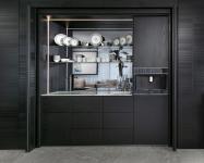 Above the two islands, Milshtein designed a pair of floating and slender lighting fixtures made of brass and serrated glass that don't steal the show. On the left, a black oak veneer unit was designed, housing the ovens and warming drawers, and on the right, the tall wall containing the refrigerator and pantry cabinet, hidden in a secret wall - between the entrance door to the daughter's suite and the door leading to the master bedroom.