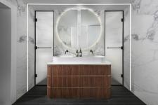 "In the guest bathroom, we wanted to create a completely different look: the walls, and even the ceiling, were covered with Brazilian marble tiles called 'Amazona'. We specially designed the Corian sink to create a feeling that it flows and pours from the wall, and inside it, we incorporated hidden waterproof lighting that washes the element with light whose source is unclear. The floor-to-ceiling mirror doubles the space and creates a reflection of light."