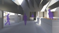 Upon entry, visitors are welcomed by an open and inviting atmosphere characterized by strategically placed planes guiding them into the market, setting the stage for an immersive journey. One circulates through the entrance and is greeted by several kiosks, a double height space illuminated with sweeping lights coming from angled roof shades, amplifying the sense of expansiveness and engagement.