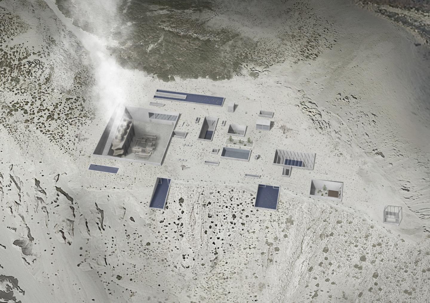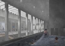 Geothermal energy is a renewable energy source in the form of heat generated inside the earth and has many applications in various industries. The geothermal power plant is a heat hub that produces electricity for Nisyros, meeting its needs. Its waste heat is consumed directly at the bathing facilities, just as geothermal sources are used by different cultures for purification and relaxation. According to a cascading system, the spaces are arranged depending on their heat and humidity requirements, creating a hybrid where all the senses are stimulated.
