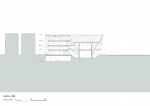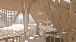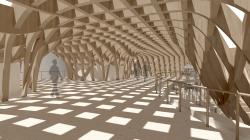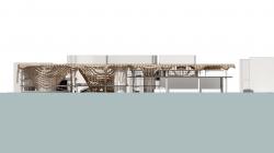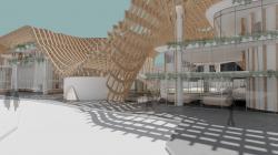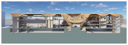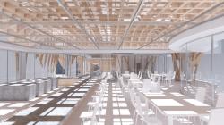 The food market occupies the ground floor for convenient access, while the upper floors house restaurants, culinary classes, and test kitchens. Setting itself apart with an organic design, the market features a glulam timber canopy that extends beyond the roofline, integrating with the structural columns to create a cohesive interior expression.