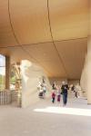 Once indoors, the view to the loch will only expand in the timber interiors. The journey visitors take to the roof observation area is also mirrored in the interior, with the exhibition spaces pushed through the journey upwards to the observation deck. The sloping steam-bent plywood light chimney will immediately draw visitors, allowing a smoother connection between all three floors and the immense void spaces to be flooded by light. The triple-height void space in the heart of the circulation and a flowing contrast to the more geometric exterior create an atmospheric entrance to the learning space. Along the way, patrons can learn about the species of birds present within Lochwinnoch, their migration patterns, and the measures being taken to protect them. The gift shop, which currently provides almost all of the revenue for the RSPB, will lie on the apex of the L-shaped plan, constantly being in view of the journey.
