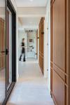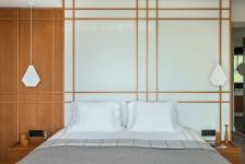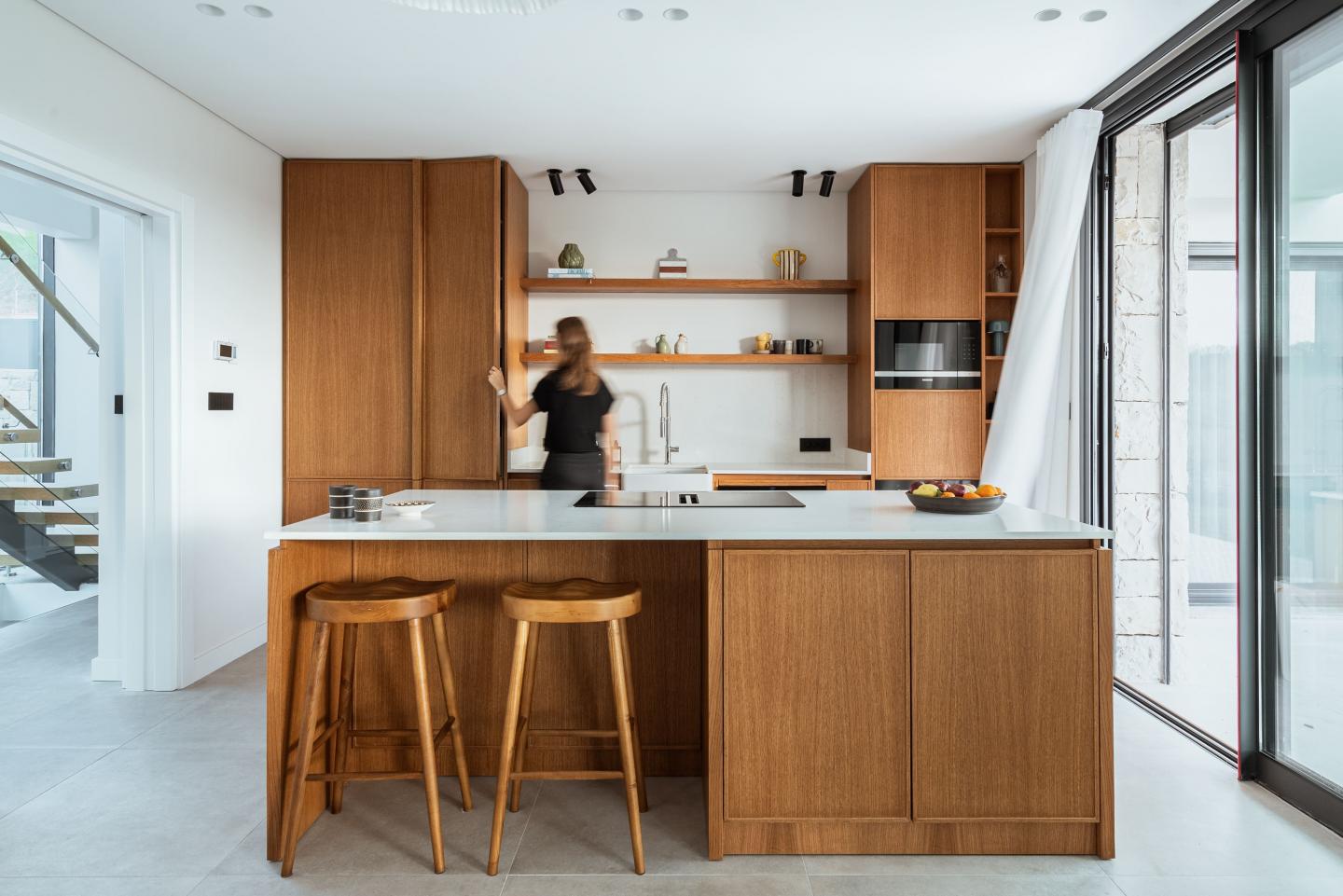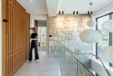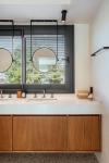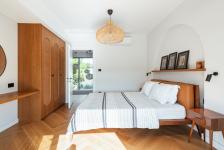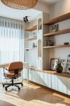 Natural materials, which is what makes the EEG House special, were used in all spaces inside as well as the outside. The flooring of the house was made up of neutral grey ceramic stones, while hand-cut natural rocks were used to cover the facade of the house. Oak wood, which fits the summer-house vibes of Urla, İzmir was chosen to be the main material. Natural oak wood finishes were used for the custom-built items in every space. Travertine stone was used occasionally, to blend certain furniture that stands out with the oak material. The TV Unit for instance uses the travertine stone heavily, however it blends in perfectly with the atmosphere. The other furniture were chosen to provide harmony inside the house, without disturbing the existing language between the custom-built items and the finishes