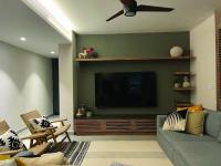 Neutral colors predominate the finishes palette. For the whole house floors light grey porcelain tiles were installed and the walls were painted in different shades of light warm colors. The white linens, curtains and upholstery of the house contrast with the neutrality of the base concept, enhancing the warmth of the spaces and generating a harmonious rhythm with the textures of the natural parotta and walnut patterns used on the woodwork.