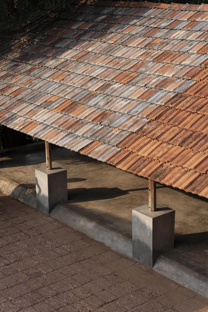 The ‘HRIDAYAM’ project is a thoughtful architectural response to the monsoon climate, seamlessly blending traditional and sustainable design elements. The clay tile sloped roof efficiently channels rainwater, ensuring quick drainage and protecting the structure, while also providing thermal comfort. The central courtyard enhances ventilation, reducing indoor humidity and serving as a natural rainwater catchment area. The use of laterite stone masonry, with its porous and weather-resistant properties, ensures durability in the face of heavy rainfall and high humidity. The L-shaped planning promotes cross-ventilation and creates semi-sheltered spaces, offering protection from the rains while maintaining a connection to the outdoors. Retaining a mango tree provides natural shade and assists in managing water runoff, while the planned addition of a Ficus tree in the courtyard adds a central visual focus, improves soil stability, and enhances the microclimate. Together, these elements reflect a sensitive and adaptive approach to monsoon conditions.
