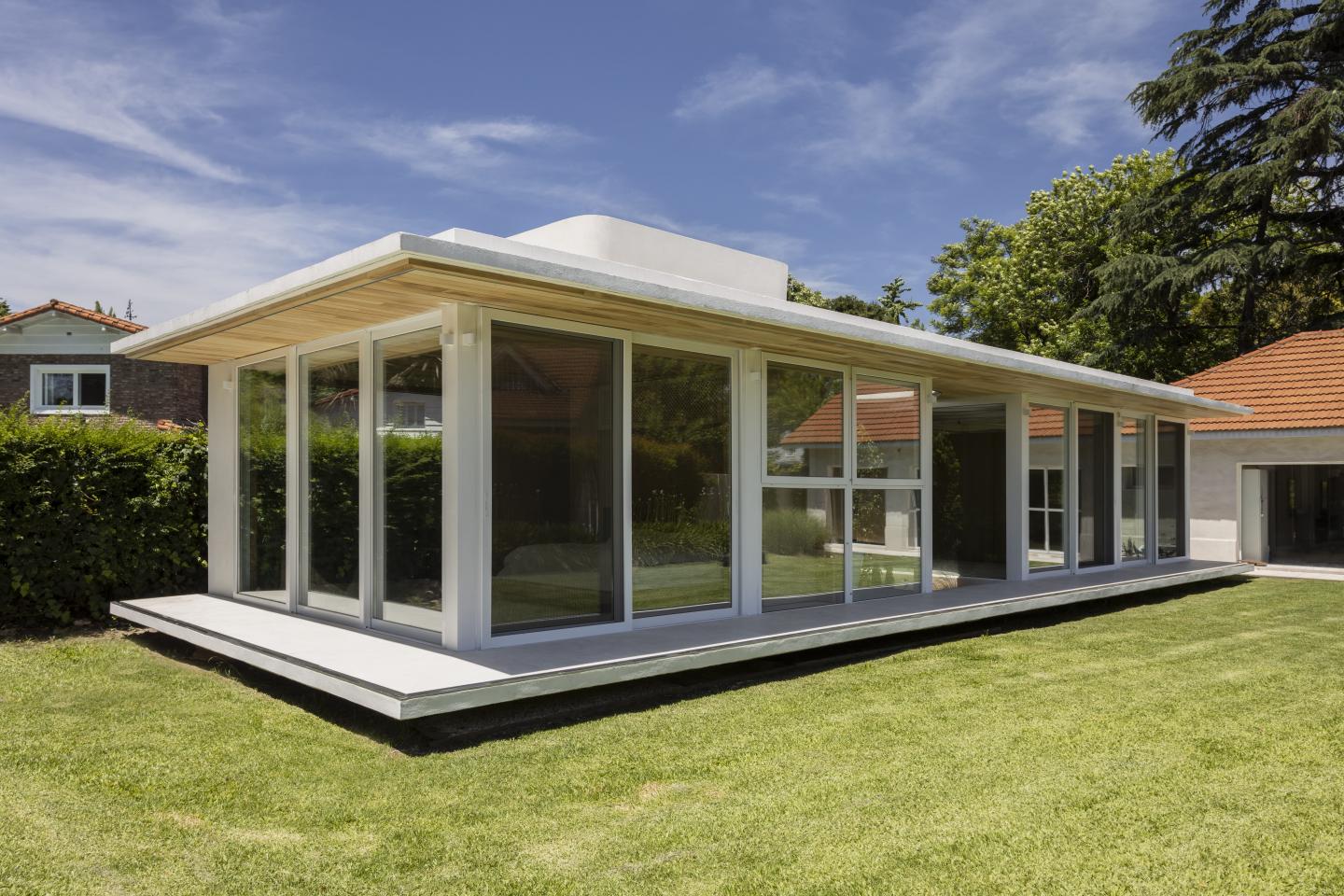 Two horizontal planes supported by 12 metal columns and floor-to-ceiling windows define the container. An overhang and a series of metal sunshades filter the intense sunlight, creating a dynamic rhythm on the facade. The accessible green roof further contributes to this function, recovering the absorbent ground previously occupied. The predominant materials are iron, concrete and glass, while wood is used in a timeless and indeterminate way.