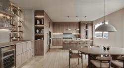 The gourmet kitchen is a centerpiece of the home, equipped with top-of-the-line appliances, bespoke cabinetry, and luxurious countertops. It is designed to be both a functional workspace and an inviting area for entertaining, flowing effortlessly into the adjacent living and dining areas.