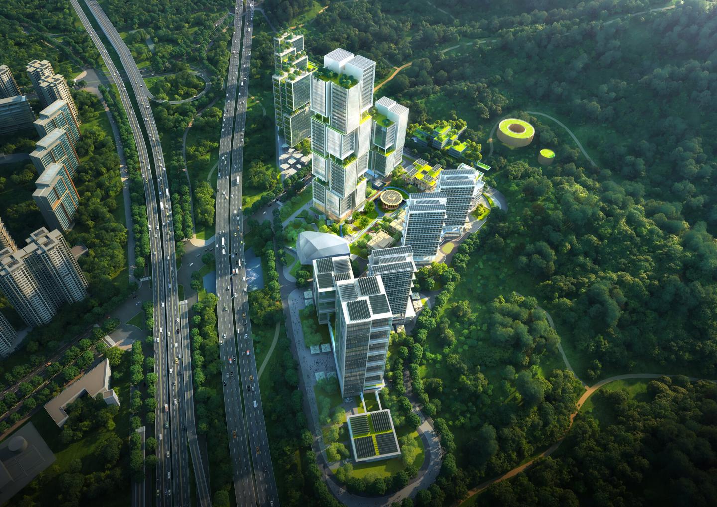 The park is designed with over 10% renewable energy and an annual carbon offset of 15,000 kg of carbon dioxide. All rooftops have photovoltaic panels, and the main tower integrates BIPV technology into its façade, functioning as a large solar energy collector that is both aesthetic and efficient.