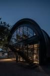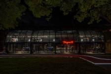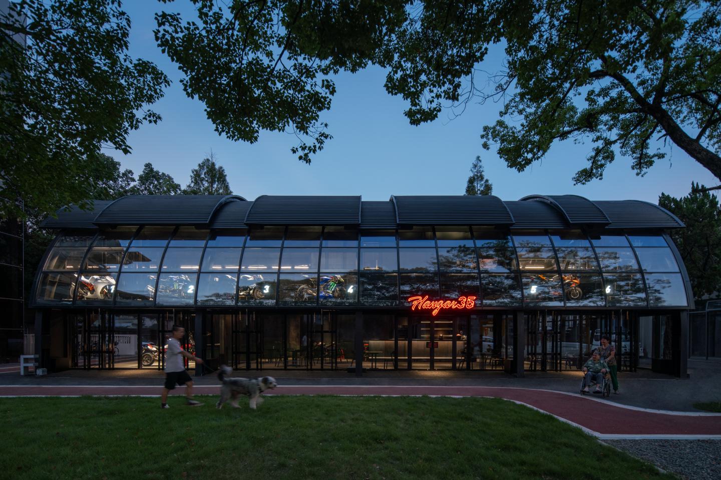 The design inspiration for Hangar 35 comes from aircraft hangars, which traditionally serve the core function of providing space for maintenance, parking, and protection of aircraft. This aligns perfectly with Hangar 35, which functions as a motorcycle maintenance and customization workshop. The overall architectural form adopts the classic arched structure of a hangar, with a modern and powerful dome made of black metal and curved glass, presenting a simple yet striking style.