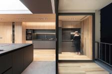 The main idea took shape when we decided to change the middle column and the level split to create a box in the corner of a white shell that houses the kitchen and dining room next to the terrace; a white box containing a combination of a gray dining area and a wooden kitchen that evoked a joyous feeling for Mehrad's mother. The laundry was also placed behind the kitchen to put more emphasis on our box.