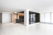 The cooking area is actually an extension of the kitchen that stretches to a corner of the terrace with a glass wall, which has good visibility and light and also works well with the terrace. The counter and the light ceiling above it also seem to be a cut-out part of the white body of space.