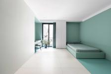 The main space of the suite is on the other side of this axis, which also has a small window. We enlarged the window both in width and height as much as possible and placed Mehrad's desk next to it so that we could get the most out of the sun. The bed was placed on the other side of the desk to get the best arrangement. Mehrad loved blue-green, so like the rest, wherever we dug the white body, blue-green came out of it.