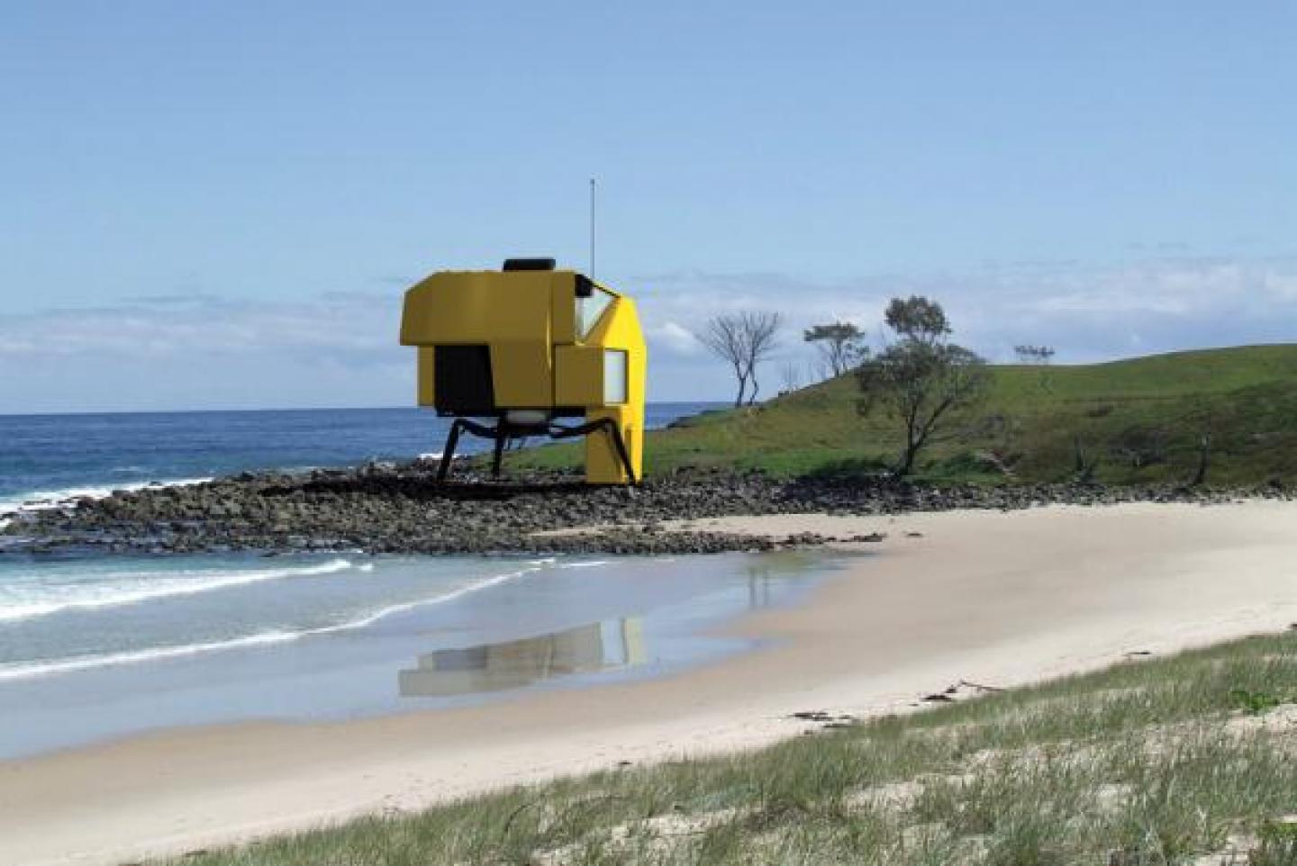 The CARAPACE HOUSE is a prototype for a fully autonomous house for a family of four living in a challenging environment. The building is raised on legs for lowest rates of footprint usage: the elevation of the body from the ground allows great adaptability to different site conditions and frees an unexpected amount of green space at ground level. The existing topography is left untouched thanks to three mechanical cranes acting as dynamic legs used to support a couple of shipping containers. These elements create the main basic structure of the house capable of pivoting over the legs themselves. Surface walls {blobs} interact with the lower steel structure {boxes} to create the spaces of the house and the partitions within. The blobs are made with composite pre-insulated panels covered with brightly colored glass-fiber layers for full protection. Outer special glasses, which dynamically whitens up if exposed to direct sun for long hours, are combined with common glasses to create a “thick active wall” used to stop the solar heating during the day and the cold in winter seasons, ensuring comfortable living conditions in any situation. The entrance door to the house is positioned at ground level. The middle level contains two bedrooms, a study/bedroom and a bathroom/sauna. The top floor is where a multipurpose space reveals its ability to transform itself from an open space into a specific space for living, dining, cooking, watching TV, meditating etc., thanks to a deployable system of devices containing the kitchen facilities, the fan/cooling and the LCD TV.