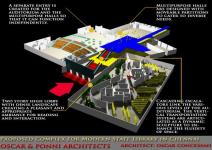 The campus is conceived as random piles of books scattered around. The translation of this concept led to the creation of three separate blocks: the tower block - the library, the multipurpose halls and the auditorium. These blocks though separated to ensure functional privacy, are connected by a well articulated continuous pedestrian arcade. The KINESTHETICS is enhanced by the nodes created in the process.