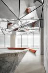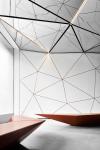 The walls of the lobby echo the triangular motif, with delicate rose-gold inlays that create a subtle yet striking pattern. These lines not only enhance the sense of depth and continuity but also lend a layer of warmth and sophistication to the neutral white palette. Here, the use of rose gold finishes creates a highlighted effect, drawing people in. The flooring, finished in seamless polished concrete, provides a minimalist canvas that balances the complex geometric elements above and around.