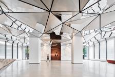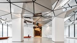 The lobby ceiling features a three-dimensional triangulated design crafted from stainless steel, inspired by a Delaunay mesh and guided by attractor points, while carefully accommodating existing beams and services. Integrated within recessed black linear profiles, the ceiling seamlessly incorporates linear LED lighting, air conditioning, sprinklers, and speakers, ensuring both functionality and elegance. For material optimization and minimal wastage, the triangulated surface is subdivided further with hairline joints.