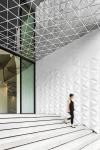 The exterior arrival sequence impresses with a striking geometric canopy and dynamic triangulation at the drop-off flooring and wall. The Drop Off wall facade features white GRC components, adorned with three dimensional triangulation, envelopes the building in a sculptural form, seamlessly blending the lines between exterior and interior.