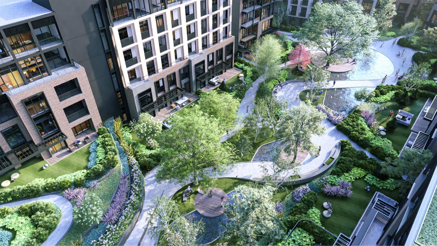 The site's sloped terrain allows the buildings to orient toward the surrounding forest views, ensuring that blocks do not obstruct each other’s facades. The location of the buildings creates a central courtyard designed for relaxation, entertainment, and leisure activities, where the landscape featuring urban furniture and water elements integrates the city’s natural elements into residential life. The plazas and reflection pools between the blocks create sensual experiences that enable all users to interact with the design. Green spaces at various levels and grass hills create activities like reading and socializing while also offering areas for recreation and children’s play.
