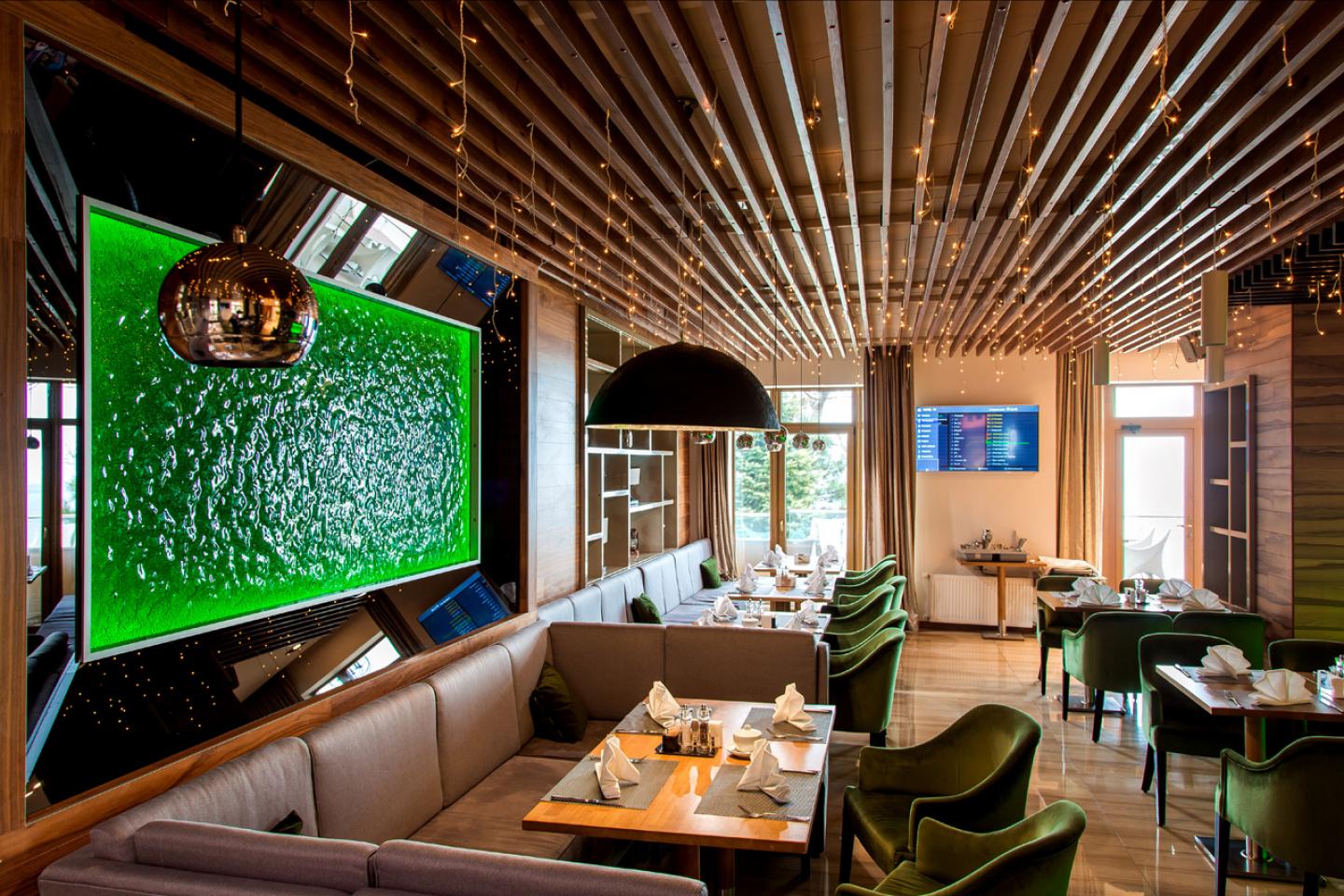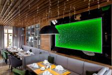 Our luxurious wall panels have become key elements in the redesign of the Hotel Panorama De Luxe. In the lobby and restaurant, our Vento glass panels in the color silver not only blend harmoniously into the interior, but also create an atmosphere of freshness and sea breeze. The bar counter in the restaurant, which is accentuated by illuminated Flora glass panels, adds a rich green tone and visually enlarges the space.