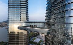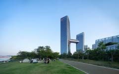 Two office towers, standing at 220m and 135m tall respectively, create an architectural image of spreading wings, symbolising Nansha's spirit of ambition and inclusivity. The twin towers are connected by an elevated sky bridge, forming an open gateway that resembles a soaring eagle from a distance, harmonising with the natural landscape of Lingshan Island.
