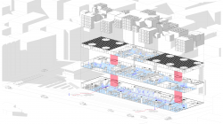 Inspired by the organic forms and functionality of trees, the design embodies a living canopy within the cityscape. The structural framework represents tree bark and branches, while the roofscape mirrors a grove’s foliage, composed of rectangular prisms at varying heights. These volumes, alongside strategically placed trees, reduce solar radiation from 393 kWh/m² to 220 kWh/m², balancing energy efficiency with a dynamic, sculptural aesthetic.