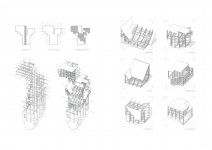 The project began with prototyping the façade design using repurposed materials to explore "layering pockets." After three iterations of physical models at a 1:100 scale using timber, BIM analysis was conducted to optimize the load-bearing system. The design was then digitally modeled in Rhino, with Keyshot used for realistic rendering and AutoCAD for detailed technical drawings at a 1=1/2'' scale to achieve construction feasibility.