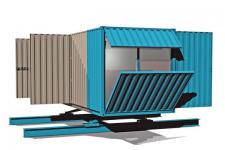 The proposal doubles the container floor area up to 34 square meters when fully opened and can be easily activated by two people in a few hours and accommodating up to four persons.