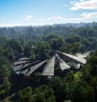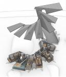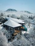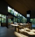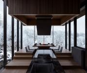 Hanafubuki House is a design for the Japanese vacation home rental company Not A Hotel. The site is located in the wooded, mountainous region of Kitakaruizawa, Japan. The design is conceived as an architectural interpretation of the Japanese word Hanafubuki, which translates to "flower snowstorm" or the sight of cherry blossom petals drifting in the wind. The house consists of a stepped, radial array of glass-enclosed wood and concrete rooms. Upon arrival at the upper end of the property, visitors enter both the house and the site at the level of the forest. Due to the site’s steep slope, the rooms step downward into the terrain, yet paradoxically, as guests descend through the spaces, they find themselves rising above the treetops. These cascading spaces encircle a serene central courtyard, where a monumental boulder—discovered on-site—becomes the heart of the house. Each room is simultaneously anchored to the courtyard’s tranquil presence and drawn outward, gradually unfurling into the landscape, as if carried away by the wind.