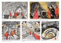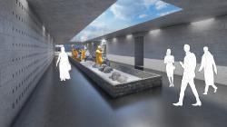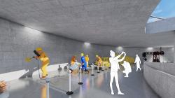 Designed with subterranean architecture, the center immerses visitors in the raw essence of a limestone quarry. The use of concrete and limestone textures replicates the rugged quality of the original excavation site, making visitors feel as though they are stepping into an active quarry. Carefully placed light wells cast dramatic shadows and illuminate geological formations, enhancing the underground experience. To deepen realism, background sounds of mining activities—the rhythmic clinking of tools, the rumble of carts, and distant echoes—create an immersive atmosphere, transporting visitors to the past.
