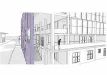 • Architectural Layer: The building itself is conceived as an adaptable framework with modular spaces, external walkways, and an open structural grid that allows for future transformations. The integration of steel, glass curtain walls, and wooden details reflects a balance between industrial aesthetics and human-centered design.