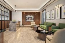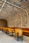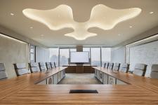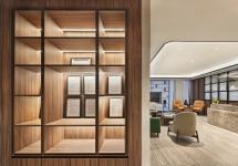 Moving on, close to the café, a unique space is carved above and beyond the list of requirements: an evening lounge where meetings can unfold in a less formal setting. This lounge has been placed close to the cafeteria to share some services, and yet, it is a breakout space where work may continue. Plush furniture, modest lighting, custom wallpaper wrapping the wall and ceiling, and the fragrance of fine coffee make this space the place to be when you have to work, but the workplace is not where you wish to be.