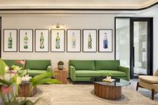 As one approaches, the lifts drop you onto the private lobby conceived and curated to reflect the brand identity; a revolving larger-than-life brand bottle catches the eye and adds a little spin to the design, quite literally. Upon exiting the private lift lobby, one steps into a meticulously curated corridor—an elegant buffer between the bustling public areas and the inner sanctum of Carlsberg’s team. This corridor subtly guides visitors toward the reception area, where bold furniture pieces and carefully chosen art create an inviting ambience.