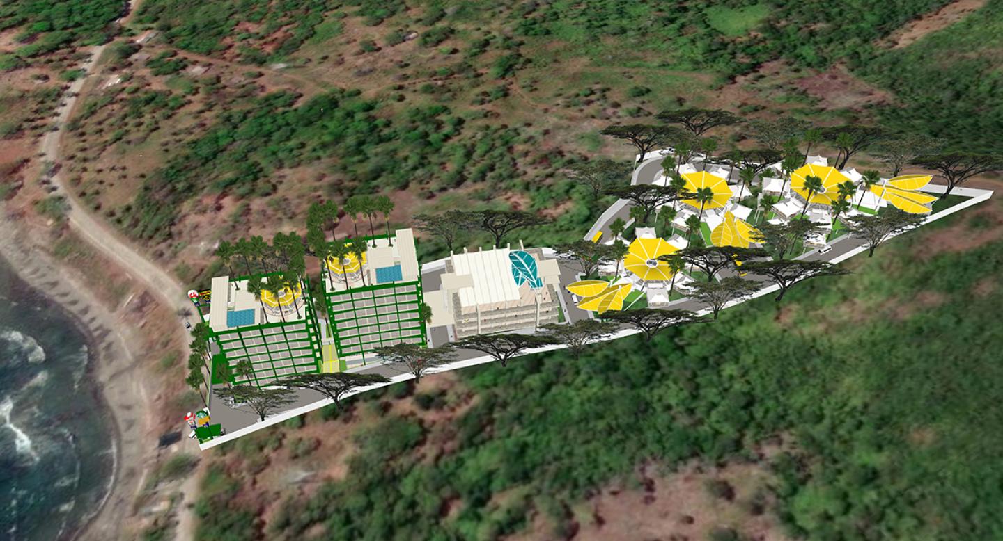 The focal point of the development will be the 8 storey mix-use twin hotel/ condominium towers with a 5 –star hotel and serviced residences, each unit with an excellent view of the beach. Located at the front of the hilly terrain the buildings will have a unique seamless glass facade with an exoskeletal frame that can withstand earthquakes better than conventional structures. The building will be highlighted at night with a LED color changing multimedia display. The ecofriendly building design features maximum lighting and ventilation, single loaded corridors and scenic elevators. Each condominium building will be highlighted by a roofdeck tensile fabric clubhouse and infinity pool.