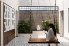 The residence features a separate parking area, offering panoramic views from the roof. Upon entry, an extended slab and circular columns create a pleasant environment. A double-height living room connects to the entrance with water features and planter boxes. A staircase with seating illuminated by skylights adds a modern touch. The play of shadows in the living area enhances its aesthetics. The office room, accessible from both the living room and foyer, opens to an inner courtyard. The dining area adjoining the courtyard features a swing, puja unit and landscape. The guest bedroom unfolds to the backyard with fruit-bearing trees, complementing a bay window.