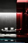 The cavernous entrance is conceived as a time tunnel, evoking the iconic information flow scenes from the classic sci-fi film 2001: A Space Odyssey. On the dark, smooth surface, the reflection of the red neon curve breaks, scattering into points, and creating a blurred and ambiguous ambiance.