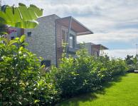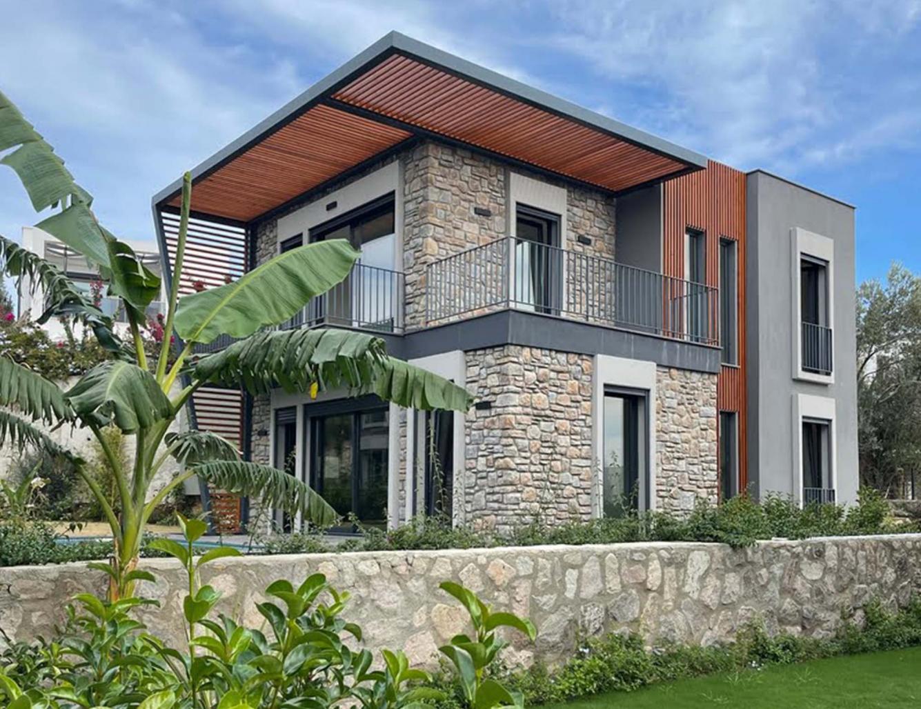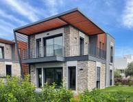 Our main approach in design was to combine natural, sustainable and innovative materials with modern and contemporary forms. In order to allow optimum daylight into the interior, we used the joinery on the facade in large sizes and with a sliding system. We placed wooden dividers on the balconies. Our principle here is that we want to preserve the sense of privacy of all villas and create the perception of contemporary form with this wooden pergola that expands as it goes up. The natural stone we lay irregularly on the facade not only adds a stylish appearance to the building, but also ensures that it keeps the building cool in summer and warm in winter. The facade created by natural stone, wood and metal panels fits exactly the way we express the modernity and sustainability perception we want.
