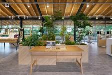 A large space under the eaves was created for the adjacent café, and a small area around the planted trees was created to extend the trees along the lakeshore and provide a space for a small marché booth.
