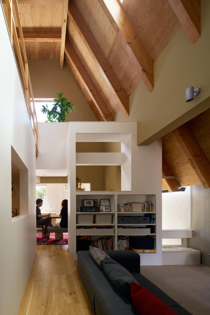 The organization of the home puts the LDK (living, dining and kitchen area), bathroom, and workspace on the first floor. The dining and living spaces are double-height, and the second floor has a bedroom and two kids’ rooms. The second floor can be perceived from the first, and the transitioning light on the underside of the roof can be sensed from inside the second-floor rooms.