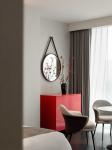 The door opens, and the light strip on the background wall of the big bed slowly lights up, like a soft greeting. Under comfortable lighting, the space forms a warm warm yellow color, and the main colors of black and red create a lazy atmosphere. Freehand hand-painted flowers herald a peaceful rest. The red side table pops into view, drawing the eye to the view outside the window.