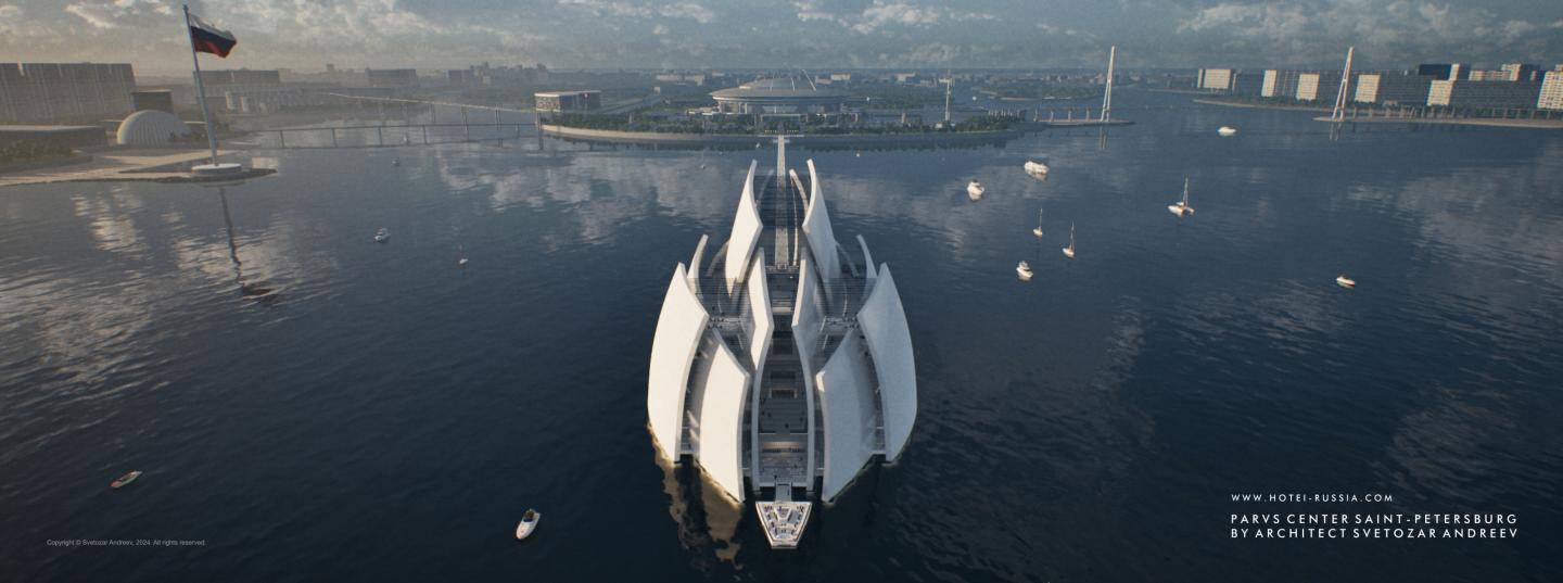 PARVS CENTER is an ultra-modern architectural complex for Saint Petersburg's new cultural city centre in the Neva Delta, its unique and memorable design is formed by a complex arrangement of curved load-bearing surfaces shaped like sails, creating a bold and dynamic silhouette of a grand ship heading into the open sea.