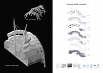 In order to represent ecological damage brought on by human activity, the museum's architecture was inspired by decomposed whale carcasses found near the Cox's Bazar shoreline. A steel construction system that reflects the museum's ecological narrative and is resilient in the cyclone-prone climate is an outcome of this idea. The form complements the location, embracing the surrounding natural beauty and merging in perfectly with the coastline scenery. The project's design philosophy relies on sustainability and site sensitivity. To preserve the delicate coastal environment, underground construction is purposefully avoided, and materials are selected to limit heat gain, which lessens the impact on the environment while increasing energy efficiency. The building's landscaping honors the area's ecological variety while blending in with the surrounding landscape, resembling the river deltas that shape Bangladesh's geography.