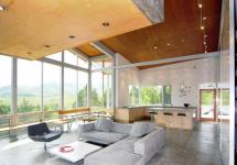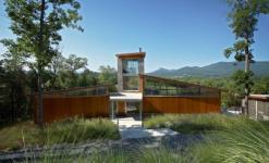 A couple from the National Institutes of Health has built this weekend house as a gathering place for family and friends, and as a place to retreat from Washington DC to pursue their interests in hiking and kayaking. The owners sought a clean, modern aesthetic that fits with the site and takes advantage of the panoramic views of the Blue Ridge Mountains. Located in a small clearing in the woods on the North Fork of Virginia’s Shenandoah River, this 24-acre property stretches from a steeply wooded mountainside north to a grassy flood plain bordering the River to the south. Their program included a 2-bedroom, 2 1/2-bath main house with other flexible spaces. They also looked for ample wall space to display a growing art collection. The charge for the Architects was to create a minimalist aesthetic while relating to the regional agrarian vernacular forms such as sheds and concrete fire towers. For maximum functionality the design was to integrate custom built-in storage and furniture with modern furnishings to be purchased.