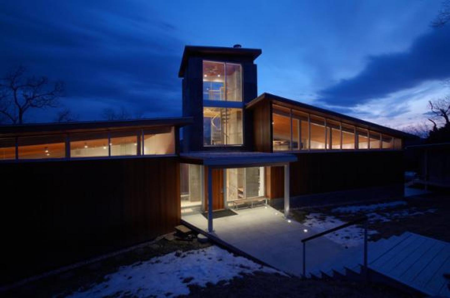The mass of the house is designed as a composition of smaller forms that follow the site contours. The scale of the House grows from an open deck area at the west side of the clearing, to a four-story tower scaled to relate to that of the east tree line. Beyond the tower, the one-story Master Bedroom wing nestles into the woods for a more intimate setting. In general, all main rooms face south, and have angled glass walls for optimal solar exposure and solid north walls to provide a thermal barrier against winter wind. In the main living space, transparency and lightness creates a home that also feels like a modern art gallery in the new sense that the architecture is not just a backdrop to the art but a compliment.