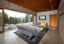 A couple from the National Institutes of Health has built this weekend house as a gathering place for family and friends, and as a place to retreat from Washington DC to pursue their interests in hiking and kayaking. The owners sought a clean, modern aesthetic that fits with the site and takes advantage of the panoramic views of the Blue Ridge Mountains. Located in a small clearing in the woods on the North Fork of Virginia’s Shenandoah River, this 24-acre property stretches from a steeply wooded mountainside north to a grassy flood plain bordering the River to the south. Their program included a 2-bedroom, 2 1/2-bath main house with other flexible spaces. They also looked for ample wall space to display a growing art collection. The charge for the Architects was to create a minimalist aesthetic while relating to the regional agrarian vernacular forms such as sheds and concrete fire towers. For maximum functionality the design was to integrate custom built-in storage and furniture with modern furnishings to be purchased.