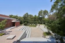 The new block fosters a sense of physical and visual connectivity with the iconic grass hillock and School of Architecture next door. The Foundation Centre and the Lecture Hall are perched in an L-shaped layout on the site and envelope the Kund that ties the two together by harbouring a new activity hub for the campus.