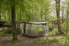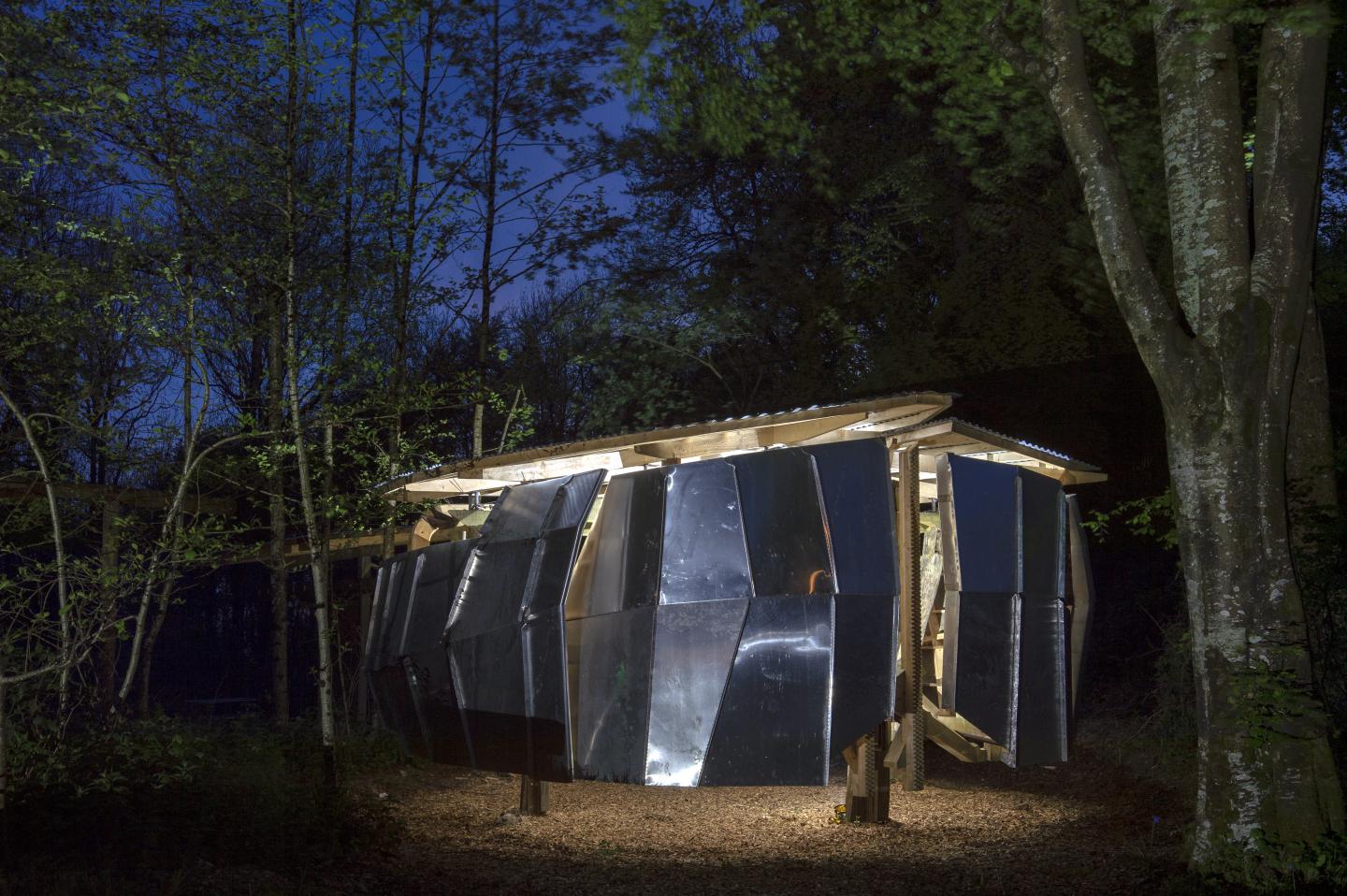 The main structure consists of three tree trunks acting as columns, supporting four cantilevered beams and a series of laminated components sculpted robotically. Our team completed the structure by extending the laminated components across a surrounding beam, developing a secondary structure and a roboticly-fabricated cladding system.