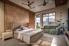 For the other master bedroom, we have thoughtfully combined fluted panels in wavy form, stone veneer and pastel shades of PU, to give a raw & robust look to this bedroom. This bedroom opens up to the garden balcony on west side with sitting area connecting the user with nature and overlooking to the entrance below.